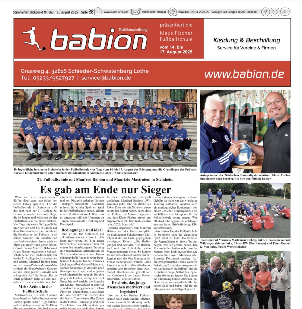 Herzlich willkommen auf babion.de! Auch 2026 wird gekickt! Hier geht’s zu Anmeldung für die Fußballschule 2026!Zum lesen des Artikels zur Fußballschule 2025, einfach auf das Bild klicken!